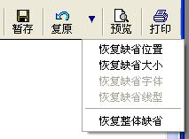 10:恢复到缺省布局:点复原按钮旁边的下拉箭头按钮,在弹出的菜单中点恢复整体缺省。缺省布局是指进入打印设计状态前用程序语句建立的布局,本演示进入打印设计前因为没有任何插入语句,所以是空白布局。此时恢复相当于清空所有内容,回到空白状态。该功能对打印维护很重要。