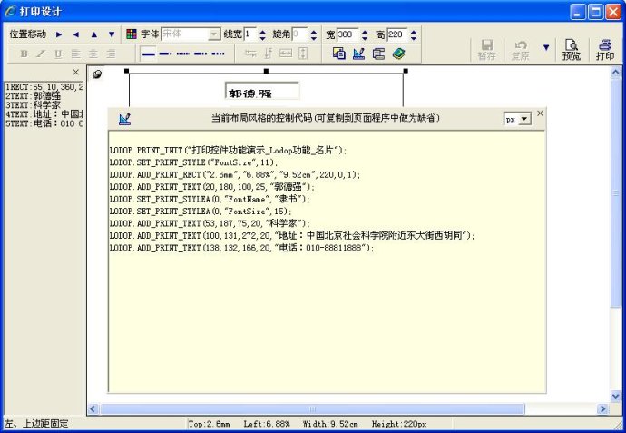 上一节讲了最简单的调用语句,这些调用如何生成的?还有哪些更复杂语句?如果就此去翻查《lodop技术手册》那将是很痛苦的一件事。事实上所有调用方法和语句都可以通过打印设计的可视操作来辅助产生。甚至控件所有样例的程序代码都是通过它实现的,下面我们详细了解打印设计。