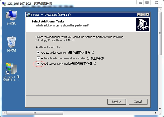 下载后执行CLodop_Setup_for_Win32NT_https_3.023Extend.exe 文件,中间有个步骤选择“云服务器工作模式”,其它步骤一律默认,见如下界面: