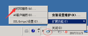 按以上章节部署完毕后,从公网主机桌面的托盘右键菜单里,可进入“AO打印服务”。