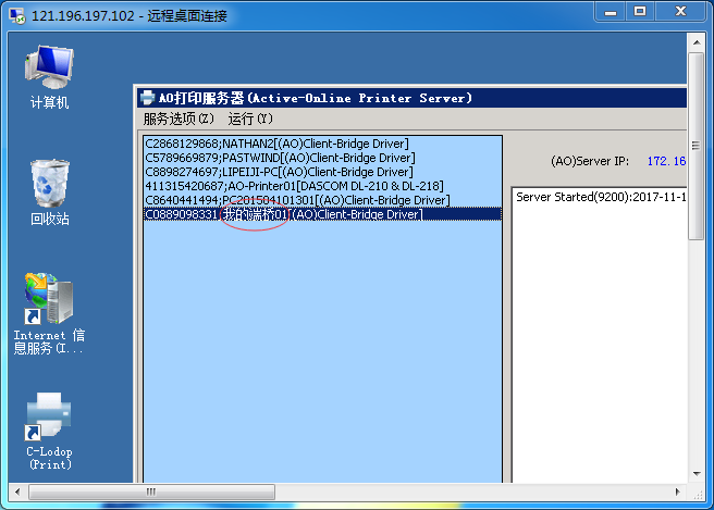 进入AO打印服务器主界面后,可以查看打印机在线情况,仔细观察名称为“我的端桥01