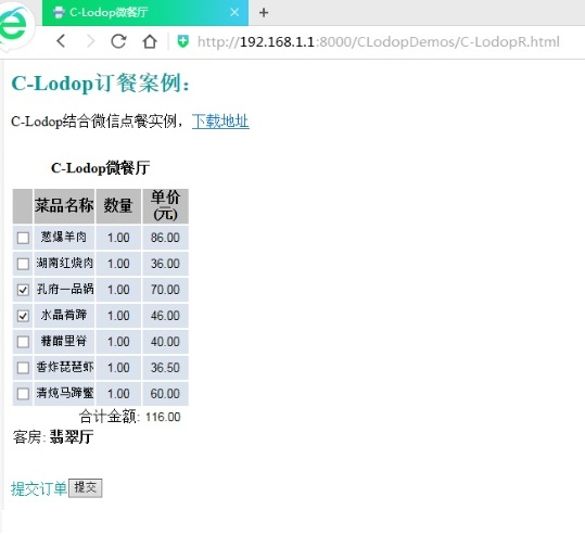 顾客点餐提交后,页面利用C-Lodop云打印服务,后台自动打印出菜品清单,从而启动后续上菜服务