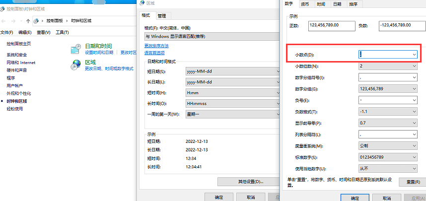 在系统的 控制面板 -> 时钟和区域 -> 更改日期 时间和数组格式 -> 其他设置 -> 数字 设置面板里 将小数点(D)属性设置一个点”.”